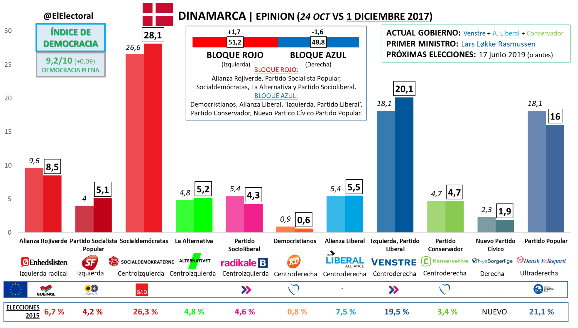 Según una encuesta electoral de Greens, los socialdemócratas suben 4 puntos en un mes y se sitúan con un 30,7 % de intención de voto. El centroderechista Venstre se afianzaría como segunda fuerza con un 19,7 %. El ultraderechista Partido Popular caería hasta el 14,5 %.