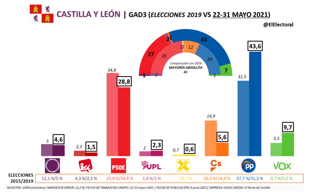 De acuerdo con esta encuesta, el PP sube hasta el 43,6 % y alcanzaría los 43 escaños. El PSOE, por el contrario, baja hasta el 28,8 % y se quedaría con 27 escaños. Vox sube hasta el 9,7 % y obtendría 7 escaños. Ciudadanos se hunde hasta el 5,6 % y mantendría 1 escaño. Podemos se sitúa con un 4,6 % y mantendría 1 escaño. UPL se sitúa con un 2,3 % y podría hacerse con 2 escaños. Izquierda Unida se coloca con un 1,5 % y se volvería a quedar sin representación. XAV se sitúa con un 0,6 % y no mantendría el escaño, según la encuesta (sin embargo, la muestra de la provincia de Ávila es muy reducida, por lo que el margen de error es alto, no descartándose el mantenimiento de su escaño).