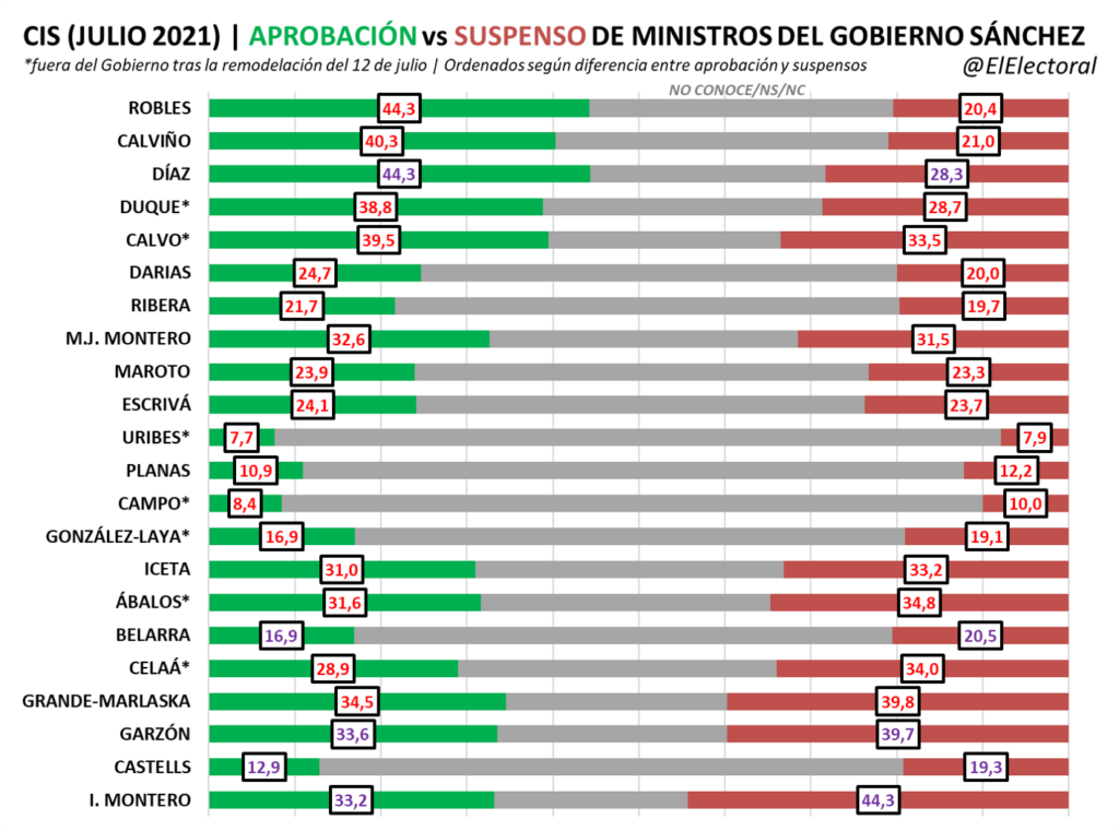 Quedan fuera del ejecutivo también los dos ministros con menor porcentaje de aprobación, ante su escasa tasa de conocimiento, Rodríguez Uribes (Cultura y Deporte) y Campo (Justicia). Salen también dos de los tres ministros socialistas con peor saldo de aprobación, Ábalos (Transportes) y Celaá (Educación y FP), pero se mantiene el peor de estos tres, el independiente Grande-Marlaska (Interior). González-Laya (Exteriores), una gran desconocida para la opinión pública también sale, tras salir desgastada por la crisis con Marruecos.