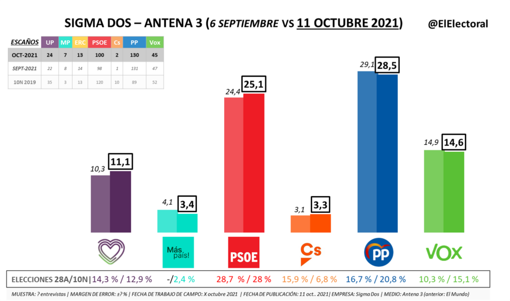 De acuerdo con la última encuesta electoral de Sigma Dos para Antena 3, el PP se sitúa con un 28,5 % de intención de voto, con lo que podría situarse con 130 escaños. El PSOE repunta hasta el 25,1 % y obtendría 100 escaños. Vox se sitúa con un 14,6 % y se quedaría con 45 escaños. Unidas Podemos se recupera ligeramente, colocándose con un 11,1 %, con lo que mantendría 24 escaños. Más País baja hasta el 3,4 % y obtendría 7 escaños. Ciudadanos se sitúa con un 3,3 % y sólo retendría 1 escaño.