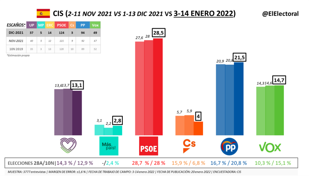 Según esta encuesta, el PSOE se sitúa con un 28,5 % de intención de voto, con lo que podría alcanzar los 124 escaños (según nuestra estimación). El PP se mantiene segundo con un 21,5 % y conseguiría 94 escaños. Vox se sitúa con un 14,7 % y lograría 49 escaños. Unidas Podemos detiene su crecimiento y se sitúa con un 13,1 %, con lo que conseguiría 37 escaños. Ciudadanos baja hasta el 4 % y se quedaría con 3 escaños. Más País se coloca con un 2,8 % y obtendría 5 escaños.