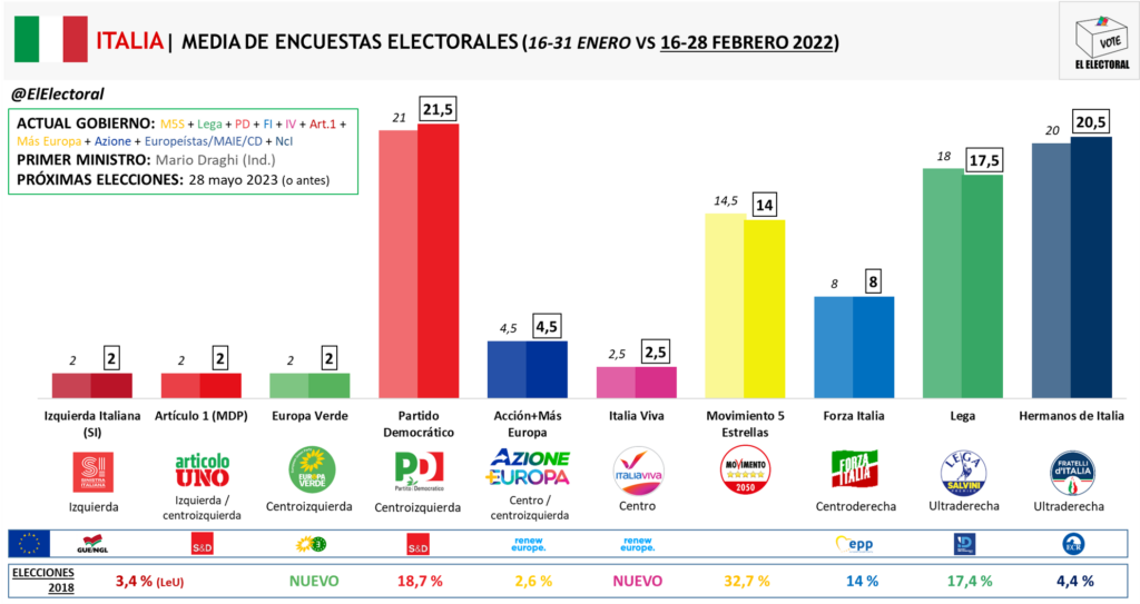 El centroizquierdista Partido Democrático y el ultraderechista Fratelli d’Italia se mantienen en cabeza en intención de voto, mientras que Lega y M5S se mantienen a la baja. El Movimiento 5 Estrellas se sitúa con su menor porcentaje de intención de voto desde enero de 2013. Mes con pocos cambios en la intención de voto. Se consolida el ligero trasvase de Lega a Fratelli producido en enero tras la reelección de Mattarella como presidente.