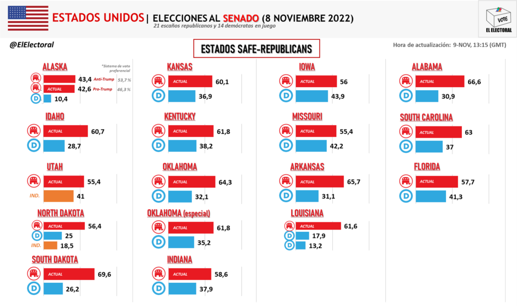Los demócratas ganaron la mayoría de los estados competidos, salvo Ohio, Wisconsin y North Carolina. Los demócratas se impusieron en estados clave como Nevada, Arizona, Wisconsin, Penssylvania o Georgia (donde hará falta segunda vuelta). Estas victorias dejan a los demócratas con 50 escaños, a falta de decidirse el de Georgia.